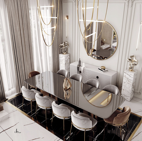 Tavolo da pranzo con piano in acciaio inossidabile argento dal design più venduto tavolo con gambe in metallo da 10 posti set di vetro sedia da pranzo trapuntata